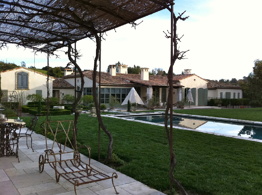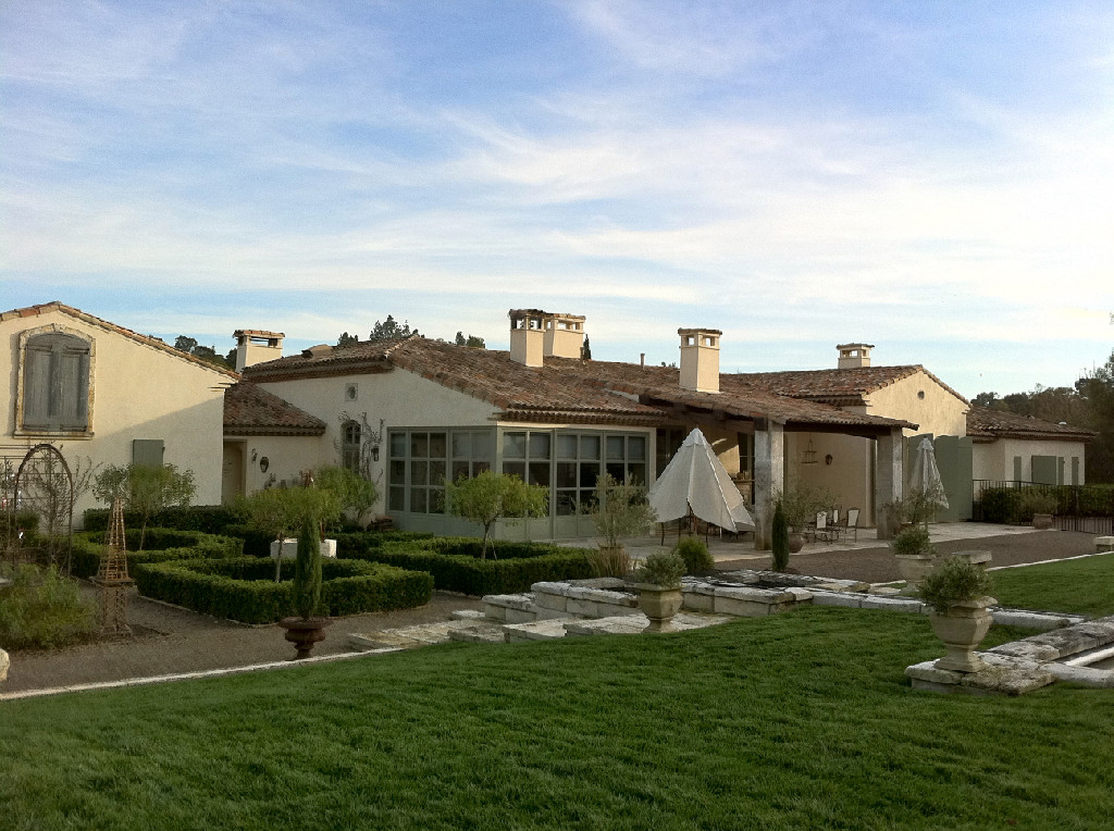 Fifteen containers of architectural pieces were imported for the home and garden. The roof is covered with re-cycled 100-year-old roof tiles. There is an old castle window in the south courtyard. Old Provencal markers have been used to line the pool, or basin, and other areas of the garden, also the tiles in the cutting garden are terra cotta.